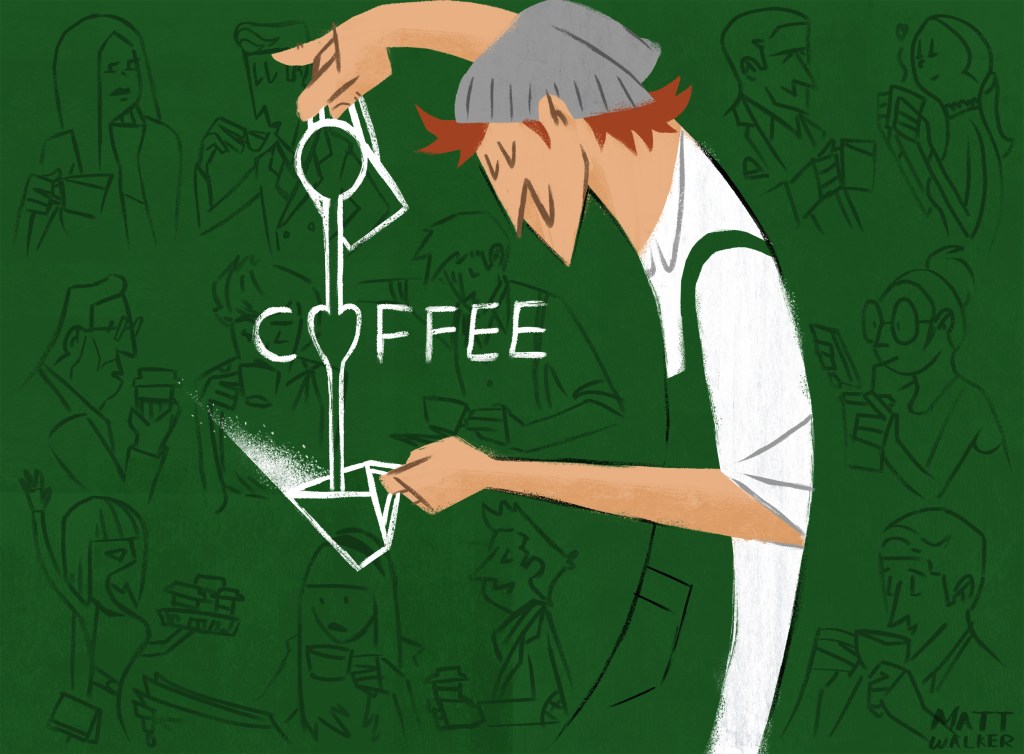 I almost always start a piece with series of pencil sketches to create the bare bones of the idea I want to develop. From there I’ll go in to photoshop and refine the sketch over and over until I have a design that I think works. I terms of the image above I literally had the barista pouring milk into the coffee cup without the heart shape. This next part is why I tend to not to work traditionally.